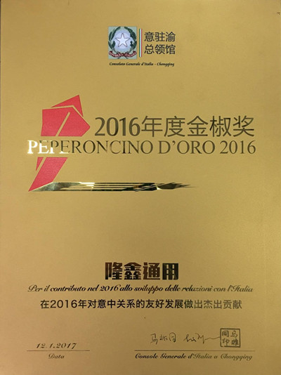 1月12日晚,尊龙凯时人生就是博z6com通用受邀出席意大利驻重庆总领事馆设立三周年庆典、第三届“情系意大利之秋”文化季闭幕仪式暨2016年度金椒奖颁奖典礼,并荣获总领馆颁发的金椒奖。