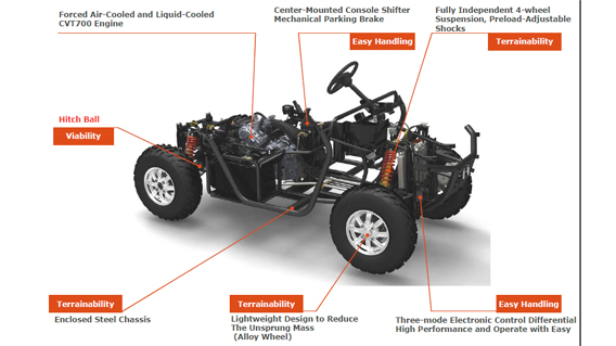 牢固简洁车架,四轮碟刹系统、铝合金轮毂、CVT传动、适时四驱