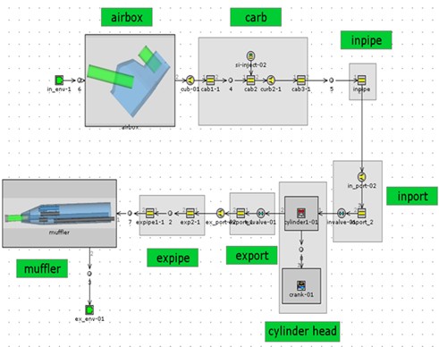 成熟的、经大量项目实践检验可靠的发动机一维热力学计算。可以预测发动机性能、充气效率等关重指标,并可根据目标对凸轮、消声器、空滤器、进气管等进行优化。