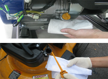 警告:确保已断开火花塞电线,并使其远离火花塞以防止意外启动。清理机油加注口周围和放油旋塞,防止污垢和碎屑掉入曲轴箱(如左图所示)。 - 在发动机下放一个盛油盒