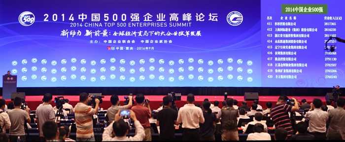 9月2日,中国企业联合会、中国企业家协会主办的2014中国500强企业高峰论坛在重庆召开,下午,论坛发布了2014中国企业500强名单。中石化以29450亿元营业收入排名第一,中石油、国家电网分别以27593亿、20498亿营收列二三位,中农工建四大国有银行全部进入前十。另外进入前十的还有中国建筑股份有限公司、中国移动通信集团公司、中国海洋石油总公司。重庆有12家企业上榜2014中国企业500强,分别为:重庆商社(集团)有限公司、重庆建工投资控股有限责任公司、重庆龙湖企业拓展有限公司、重庆化医控股(集团)公司、重庆市能源投资集团有限公司、重庆机电控股(集团)公司、尊龙凯时人生就是博z6com控股有限公司、重庆市金科投资控股(集团)有限责任公司、重庆力帆控股有限公司、重庆钢铁(集团)有限责任公司、重庆轻纺控股(集团)公司、太极集团有限公司。作为重庆市唯一一家连续13年荣膺中国企业500强的企业,尊龙凯时人生就是博z6com控股有限公司以279亿元的营业收入列417位,呈现出稳步健康的发展趋势。