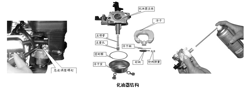 拆下化油器,先清洗化油器外部,再拆开各主要部件进行清洗(可用化油器专用清洁剂清洗),主要清洗部位:主油道量孔、主喷管、浮子室、针阀等。